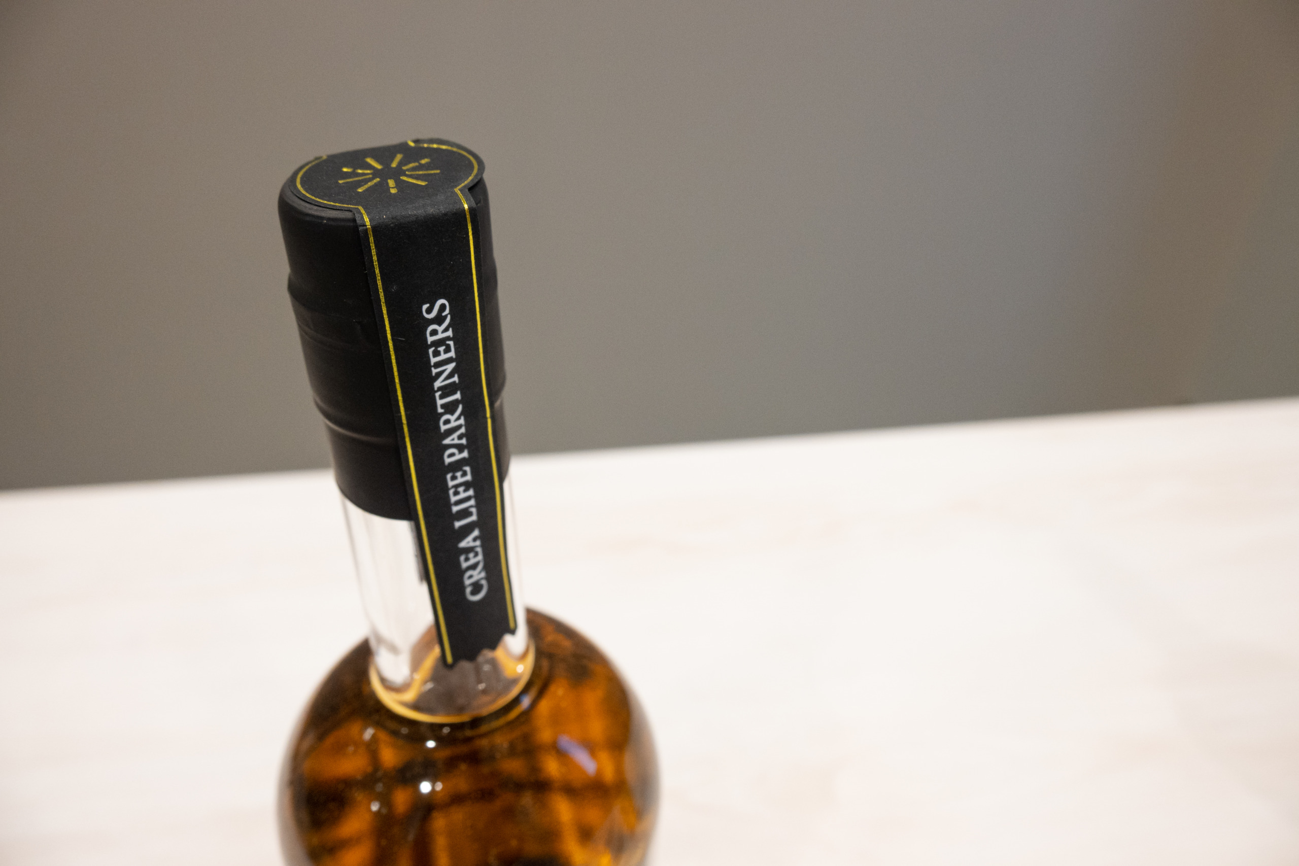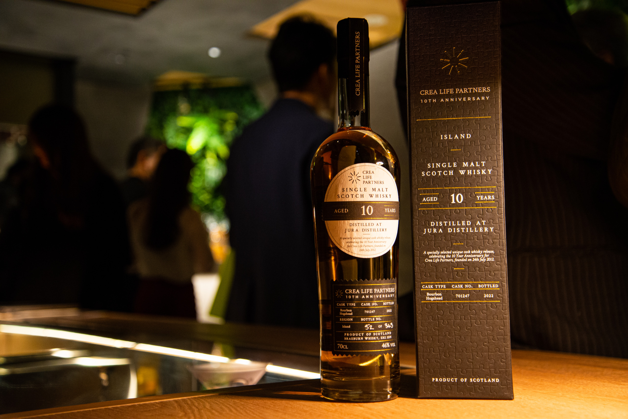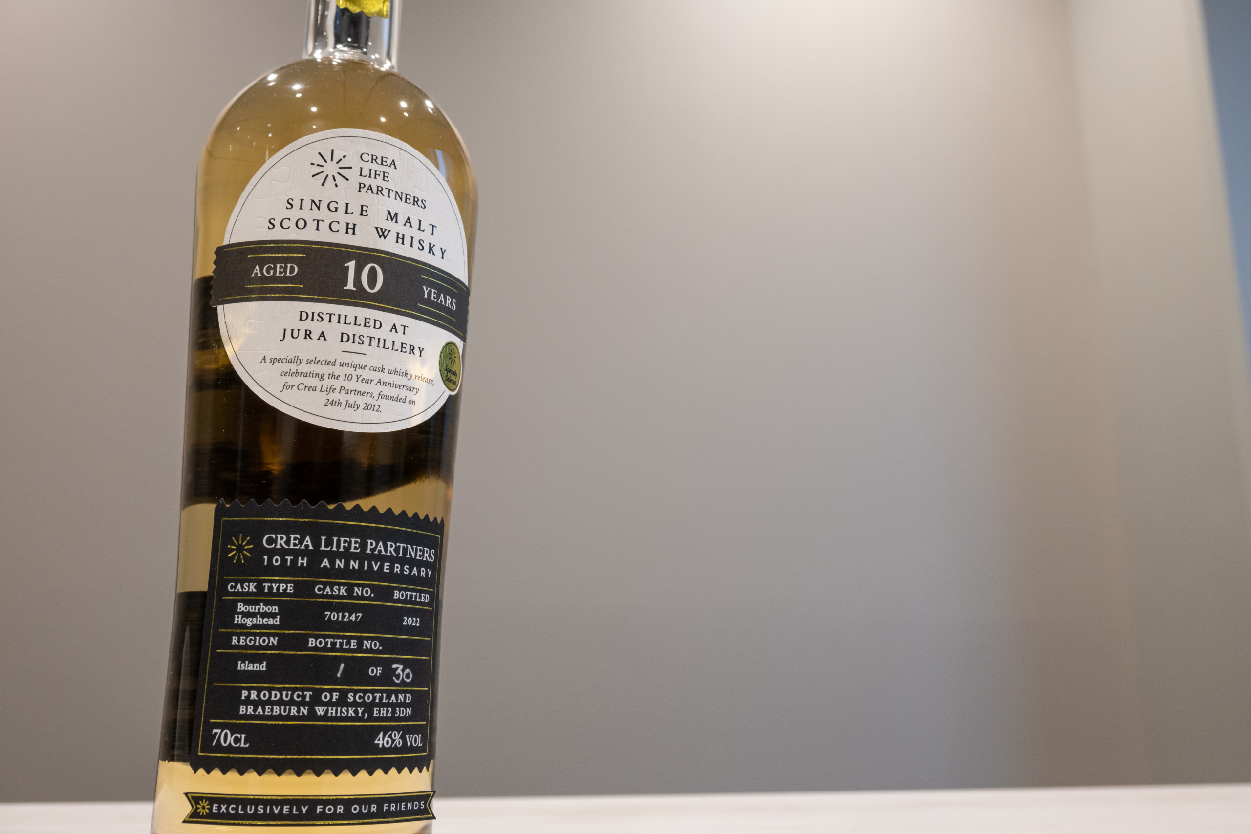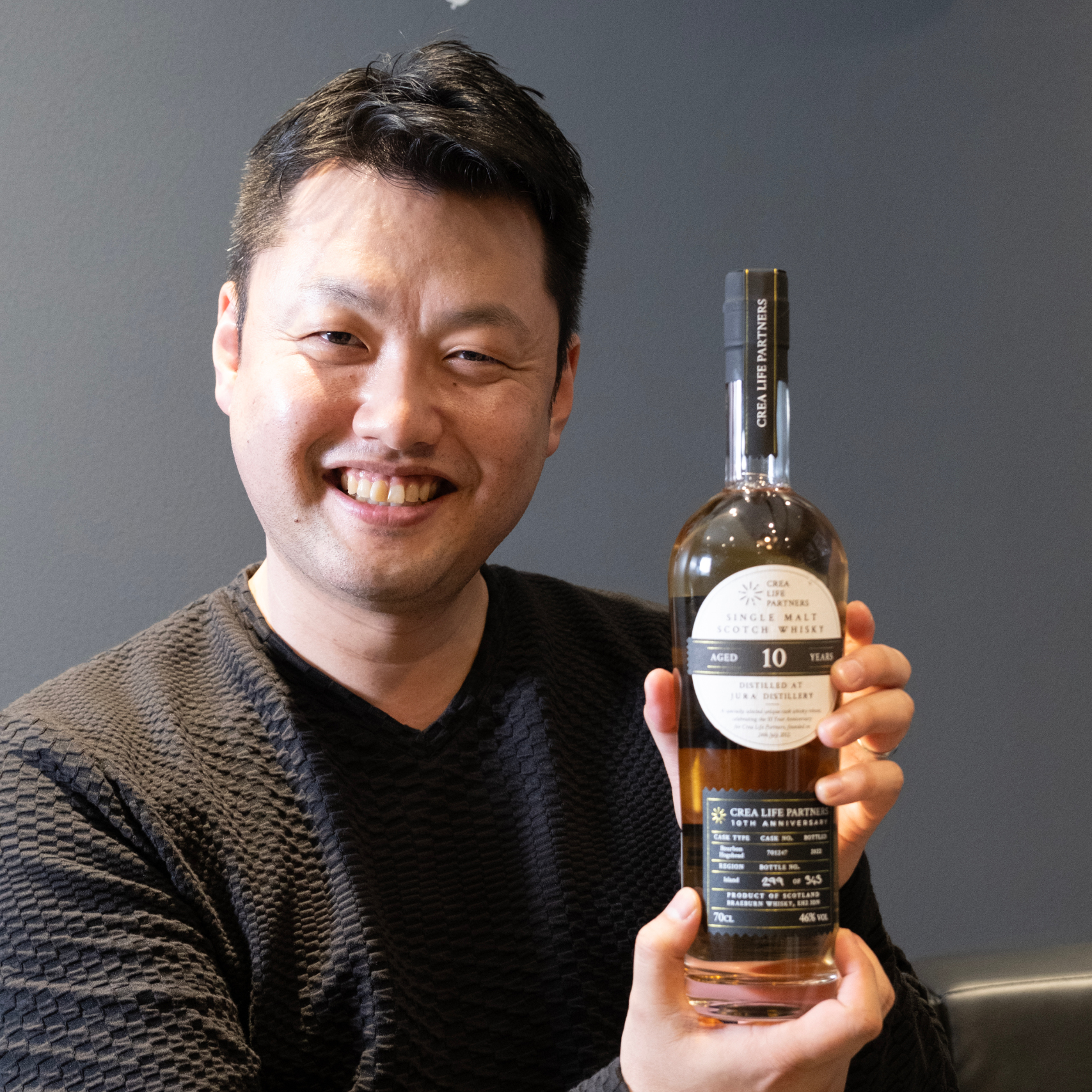 このボトルはクレア・ライフ・パートナーズ(以下CLP)の設立10周年を記念して作られた物で、10年という経営をしていく中で山場ともいえるこの期間を乗り越え、その喜びを社員そしてお客様と共に分かち合いたい、そんな特別な思いを込めたくて作りました。弊社はウイスキーの樽を自身でお持ち頂けるサービスを運営しているのですが、樽を保有できる魅力の他にも、保有したウイスキーを楽しんでいただくということに、より強い魅力を感じたことも今回ボトリングに繋がったきっかけでもあります。また私自身ウイスキーが好きで自分のオリジナルボトルを持ちたい、作ってみたいという気持ちからスタートしました。